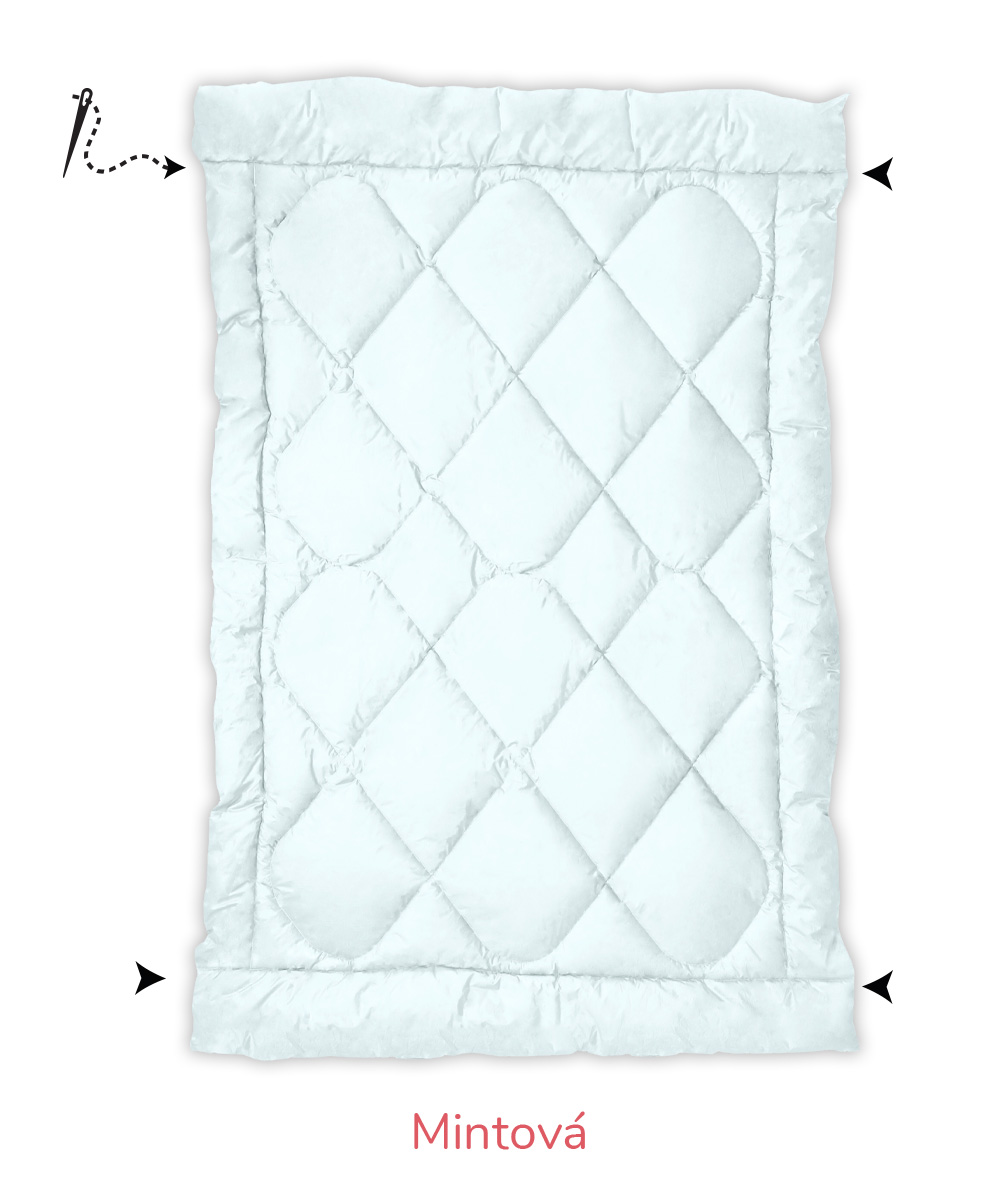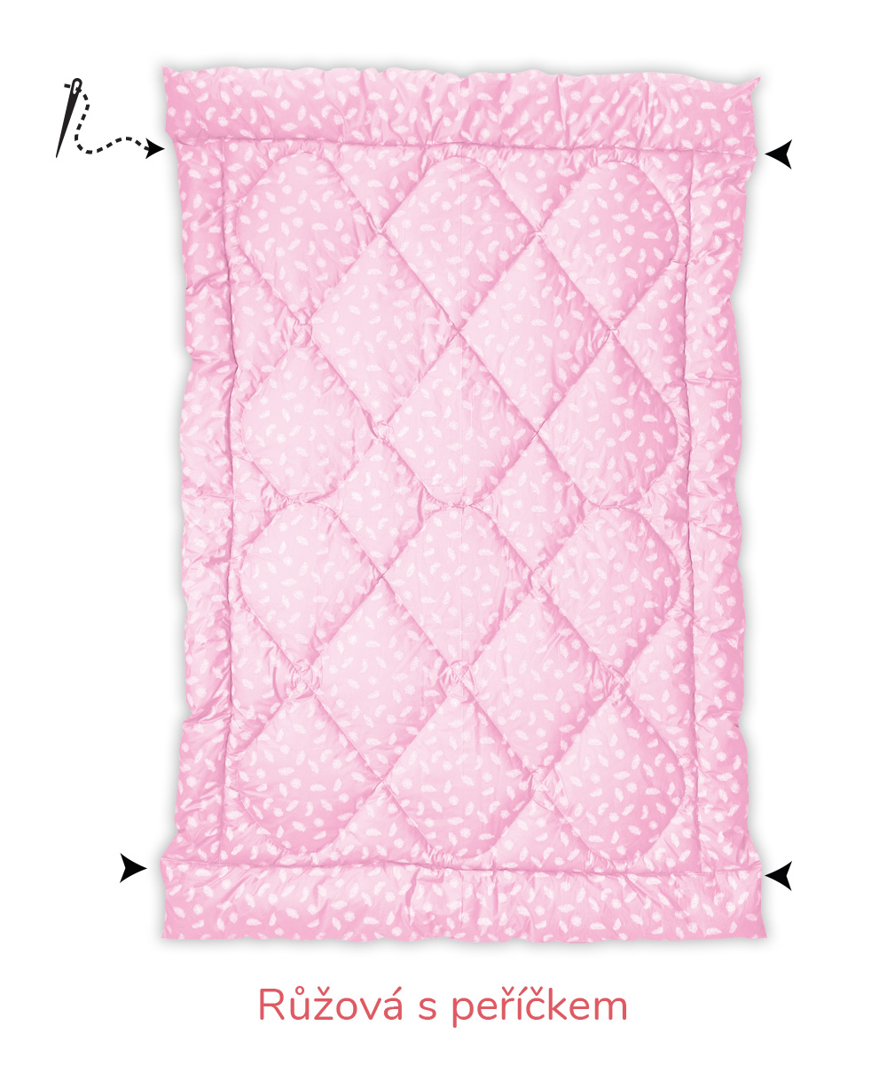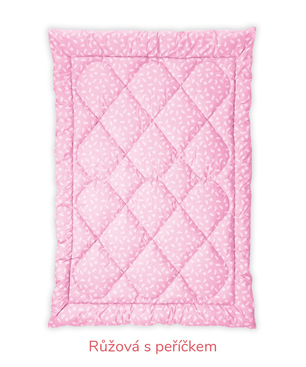 B – Romana – pro náročnější zákazníky, materiál 100% bavlna, jemnější, lehčí, ale hustě tkané sypky, vazba kepr, gramáž 140 g/m2 – bílá, krémová, růžová, modrá, mintová. Sulpa s tiskem – materiál 100% bavlna, pevný, hustě tkaný sypek, vazba plátno, gramáž 165 g/m2 – růžová s peříčkem, modrá s peříčkem.
